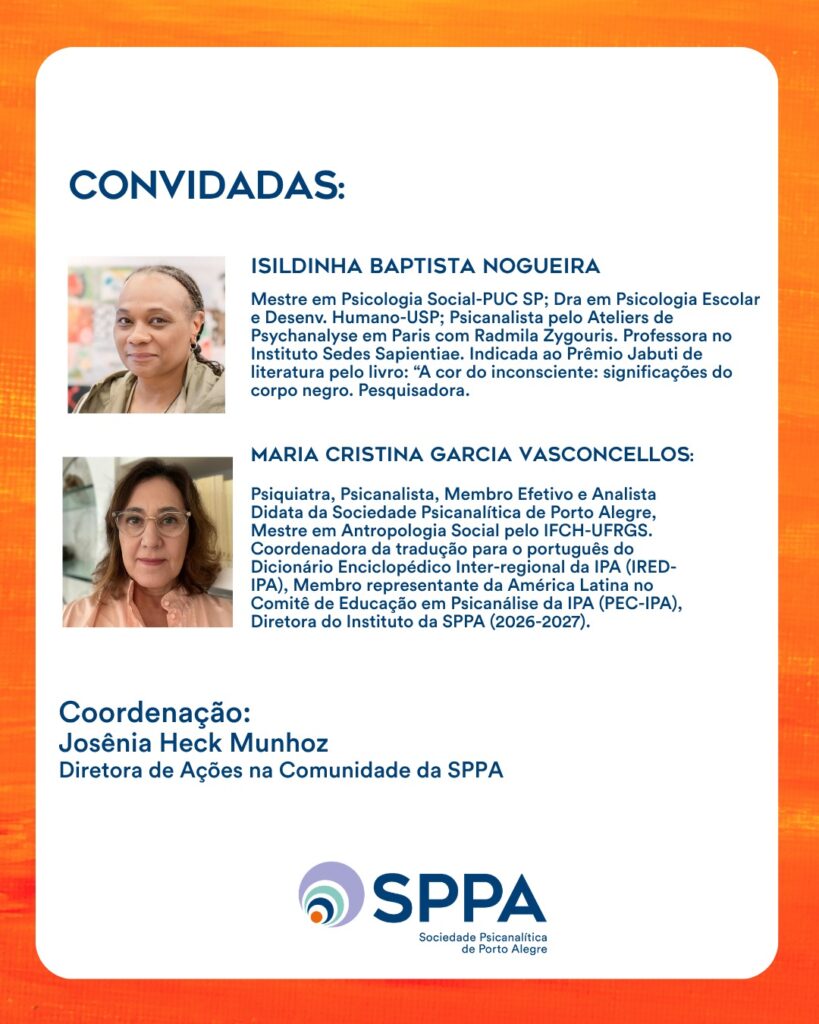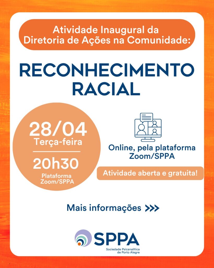 Convidamos para a Atividade Inaugural da Diretoria de Ações na Comunidade: Reconhecimento Racial, dia 28 de abril (terça-feira), às 20h30, na Plataforma Zoom/SPPA.