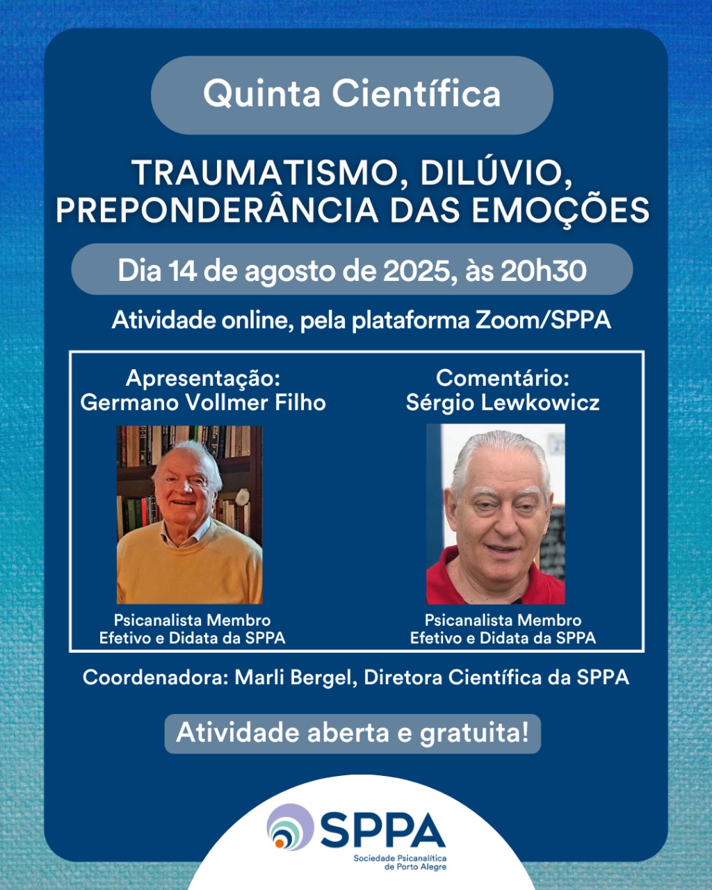 Online Google MeetCiclo de Estudos: “Sonhar, pensar e viver a psicanálise: reflexões a partir de Thomas Ogden” Destinado a acadêmicos e profissionais de medicina e psicologia Data: 08, 15, 22 e 29 de agosto. Horário: 14:00 às 15:00 Numero de participantes: 15 participantes Coordenação: Carmen Lisboa Weingärtner Welter Psicanalista, Membro Associado da SPPA. Online, pelo Google Meet Investimento: Estudantes... Leia mais »