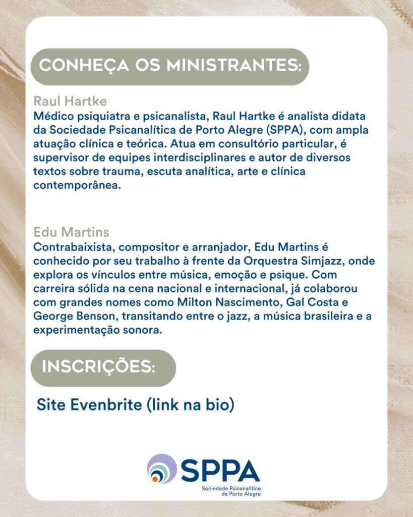 A Música como Linguagem: diálogos entre Arte e Psicanálise, com Raul Hartke e Edu Martins, dias 13, 14 e 15 de janeiro, das 19h às 21h, no Instituto Ling (Rua João Caetano, 440).
