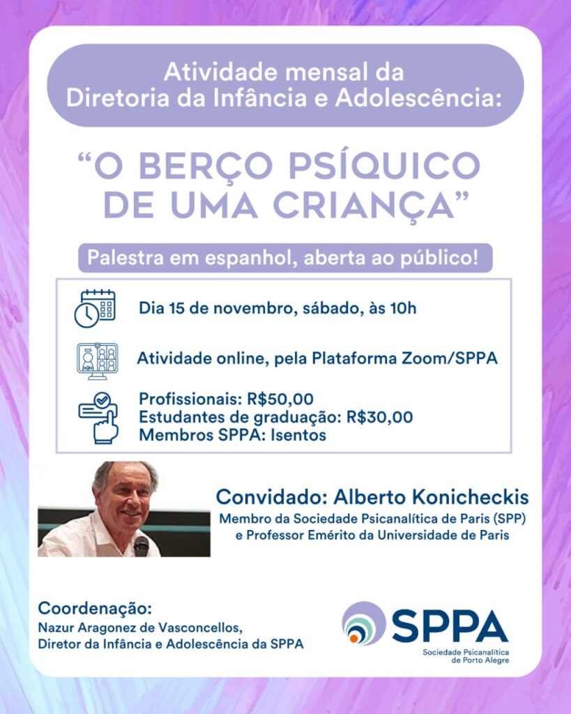 Convidamos para a Atividade Mensal da Diretoria da Infância e Adolescência “O Berço Psíquico de uma Criança”, no dia 15 de novembro (sábado), às 10h, on-line, pela Plataforma Zoom/SPPA.